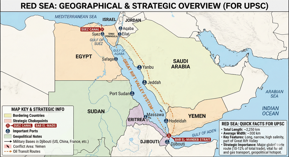 The Red Sea is a strategically crucial water body connecting the Mediterranean Sea (via the Suez Canal) to the Indian Ocean (via the Bab el-Mandeb Strait).